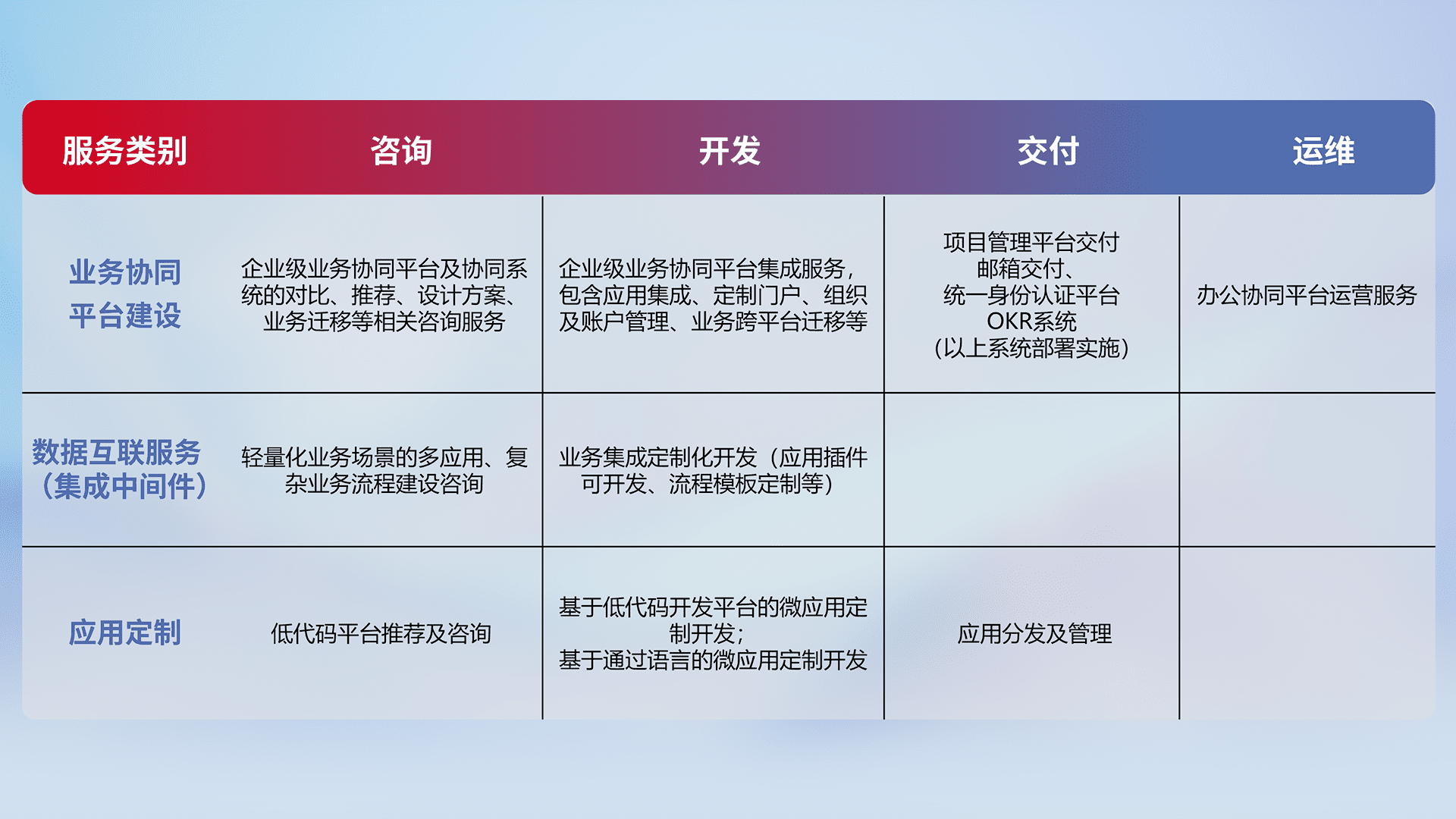 针对钉钉、、、企微、、、IDaas等平台级产品提供产品的规划、、方案、、、交付、、、定制化开发等服务,,,实现如统一协同办公、、、、智能客户服务、、混合会议管理、、、、智能数据查询、、等业务场景,,,实现数字化转型。。。