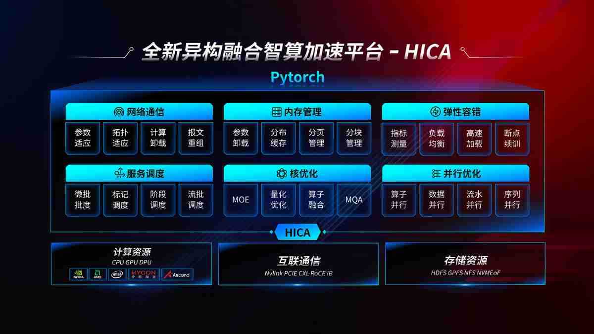 通过自研的服务层、、、、中间适配层、、以及调度编排算法,,采用数据并行、、、模型并行等多种并行方式,,把并行计算任务进行有效的分解,,使其分别由相应的软件栈和算力资源来承接。。当GPU资源变化,,,HICA可以实时动态调度计算子任务并调整模型拓扑和架构,,,,以充分聚合各种算力资源。。