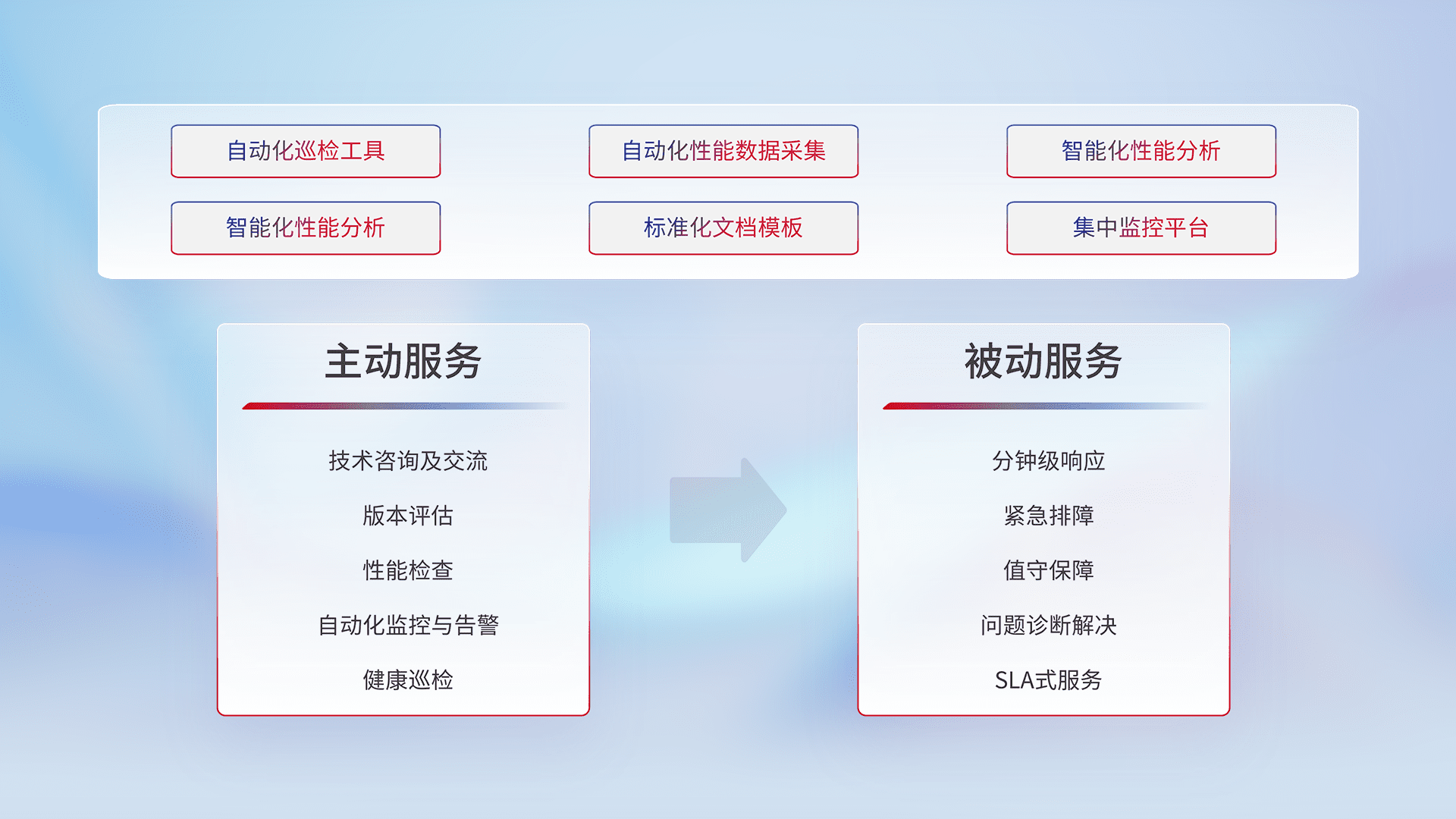智能化工具和标准化文档,,保障服务质量,,,提供主动服务(包含技术咨询、、版本评估、、、性能检查、、、、自动化监控与告警、、、、健康巡检)和被动服务包含(分钟级响应、、紧急排障、、、值守保障、、、、问题诊断解决、、SLA服务)。。。。